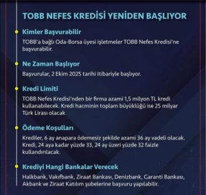 “Odamıza kayıtlı KOBİ üyelerimiz 2 Ekim 2025 tarihinden itibaren kredi başvurusu yapabilecekler. Nefes Kredisi kapsamında bir firmanın azami 1,5 milyon TL’ye kadar kredi kullanabileceğini, kredi hacminin toplam büyüklüğü ise 25 milyar TL olacak.