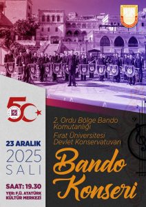 F.Ü 50. Yılına özel olarak düzenlenen 2. Ordu Bölge Bando Komutanlığı ve Üniversite Devlet Konservatuvarı iş birliğiyle hazırlanan “Bando Konseri”, askeri ve akademik birikimi aynı sahnede buluşturacak.